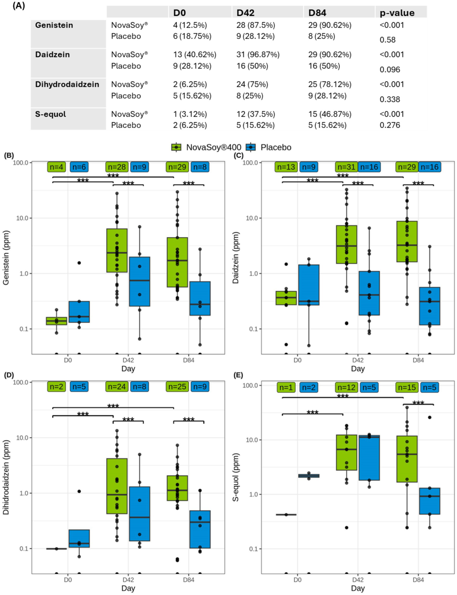 In addition, supplementation with Novasoy®400 significantly increased the concentration of all four metabolites from D0 to D84, as determined by the Wilcoxon test (p < 0.05) (Figures 4B–E). Notably, genistein level increased by 30-fold from baseline within the Novasoy®400 group (p < 0.001) and was 8 times higher than the placebo group at D84 (p < 0.05) (Figure 4B; Supplementary Table 2). Similarly, daidzein and dihydrodaidzein concentrations were 16.6- and 4.3-fold higher, respectively, compared to the placebo group producers at D84 (p < 0.05) (Figures 4C,D; Supplementary Table 2). S-equol levels were also 1.56 times higher in the Novasoy®400 group than in equol producers in the placebo group at D84, driven by a within-group increase from 0.42 ppm ± 0.00 at D0 to 9.0 ± 10.64 ppm at D84. Due to the low number of producer subjects in the NovaSoy ®400 group at baseline (n = 1), within group statistical testing was not applicable. No significant change in S-equol was observed in the placebo group (p = 0.38) (Figure 4E; Supplementary Table 2).