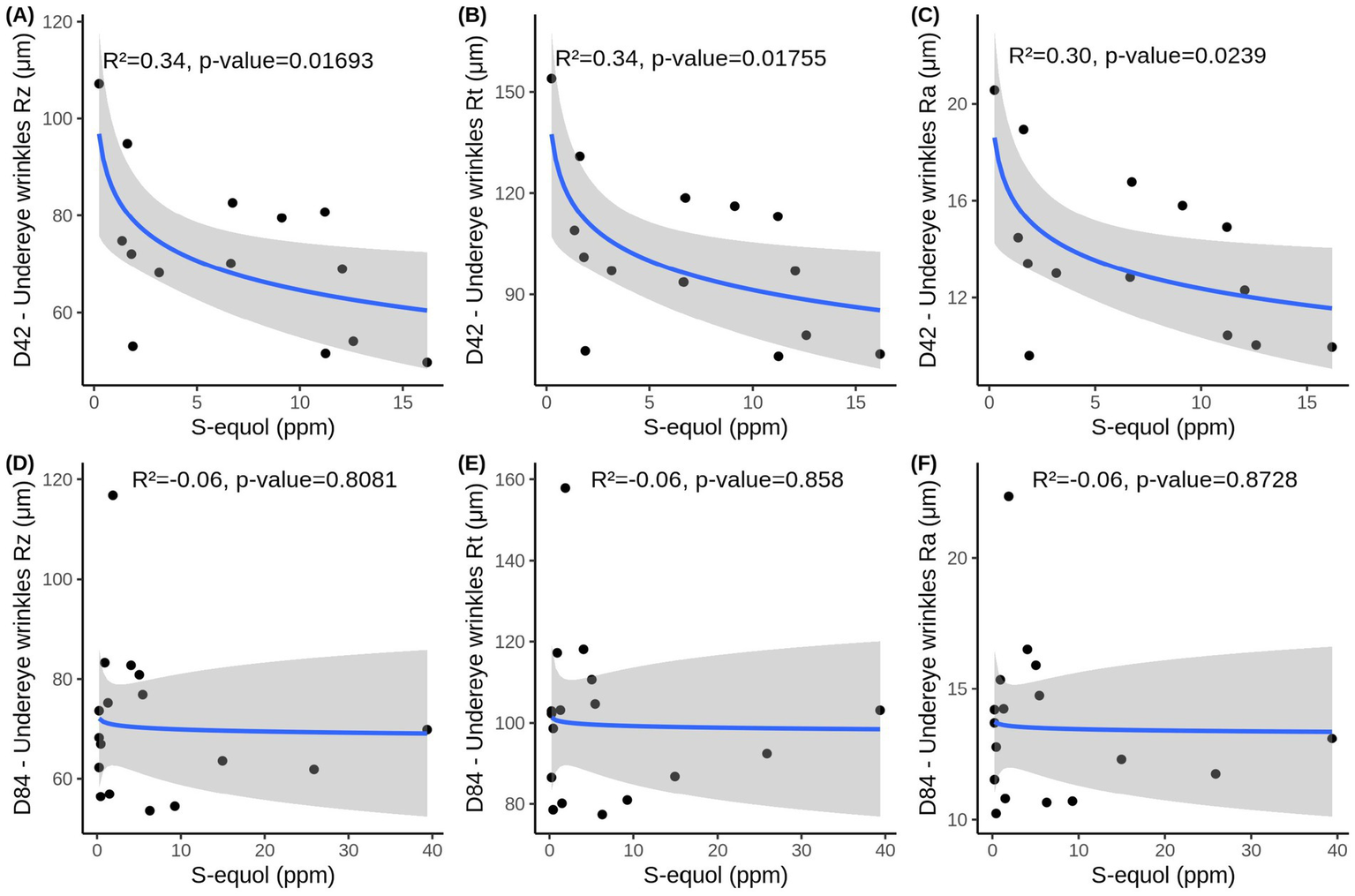 On Day 42, Figures 5A–C show a clear inverse, non-linear relationship between S-equol levels and undereye wrinkle severity, with higher S-equol concentrations associated with lower wrinkle scores (Rz, Rt, and Ra). These associations are supported by moderate R2 values, with approximately 30–34% of the variability in wrinkle depth, total height, and surface roughness explained by S-equol levels. These statistically significant results suggest, a moderate and meaningful relationship and indicate a potential beneficial effect of S-equol on undereye wrinkle appearance at this earlier time point. Of note, the most substantial improvements in wrinkle appearance occurred within the 0–5 ppm range, after which the effect plateaued, indicating that a maximum level of improvement may have been reached, after which further increases in S-equol provided diminishing additional benefit. By Day 84, this relationship was no longer observed (Figures 5D–F), nor was it apparent when both D42&D84 time points were combined (Supplementary Table 3), potentially reflecting a saturation point in the skin’s responsiveness to S-equol or the achievement of a new equilibrium in wrinkle morphology.